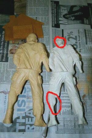 RECAST FAQ WHAT IS A GARAGE KIT? This goes back to the roots of the figure modeling hobby as we know it today. In my mind’s eye, the story goes something like this: It’s the 80’s. Some guys who grew up building Aurora’s classic figure kits in styrene looked around and decided that they wanted to see some of their favorite characters from movies, comics, and the like made into model kits. They picked up some clay and began to sculpt their own. They took the sculpts and made silicone molds into which they would pour two-part resin plastic to produce kits they could sell to or trade with fellow enthusiasts. These cottage industry productions were carried out in the basements and garages of these brave pioneers. Hence the term "garage kit." As the years passed, the hobby grew. It already existed in its own form in Japan. Japanese and American producers became more and more savvy and professional and the hobby emerged from a solely garage-based set of ventures and sprouted some larger operations. These companies had names like Billiken, Horizon, Screamin, and Geometric. Many of the early companies invested in metal molds and cast their kits in vinyl rather than resin. But the whole time, the garage operations continued and the name "garage kit" stuck even when people were referring to kits produced by these larger operations. Today, these big companies aren’t around any more, and few new vinyl kits are produced. But the hobby is far from dead. We have gone back to the future in a way – back to smaller resin operations. However, today’s sculptors and casters, thanks to the natural evolution of the hobby, are much more sophisticated and use techniques the pioneers never dreamed of to produce outrageously accurate and detailed kits that are beautifully cast and a joy to build. You should appreciate that most of these operations, while capable of making very professional products, are operating on a shoe string. With all of the costs of production, these are usually break even type ventures where any profits simply go into producing the next new offering. In short, these operations exist because these small producers are fellow enthusiasts and love of the hobby; no one’s getting rich here and these are essentially individuals (as opposed to say, big nameless corporations). While there are many good websites to check out relating to this hobby, if you want to get a quick overview of what’s going on right now in terms of new kits produced in the last few years, a good place to start is: Buc Wheat’s Modeling World at: http://home.cshore.com/bucwheat/ WHAT IS A "RECAST"? It’s an unauthorized copy of a kit. The copies are usually made of resin, but some well-financed re-casters (especially in Asia) are capable of making vinyl copies. In simple terms, recasting happens when unscrupulous individuals obtain an original of a kit and use it as a master to make their own mold and produce cheap knock-offs. These copies are referred to as "recasts." Recasts are ALWAYS inferior to the original kit. Just as a photocopy of photocopy is worse than a photocopy of an original, a recast of a kit is necessarily worse than a casting that comes from a mold made using the original prototype. Detail and crispness is always lost. Add to that the fact that re-casters don’t really care about the modeler, but only making a quick buck, and therefore do things like: use cheap materials (e.g., brittle, bad-smelling resin); do slip shod quickly casting jobs (e.g., resulting in offset seams, pin holes, and uncured spots); use molds that are worn out (silicone molds start to break down after a certain number of castings from the heat generated as the resin sets); don’t bother to produce unusual parts (e.g., white metal or vacuform plastic accessories); and don’t bother to produce box art or even include a box with the kit. What does the re-caster care if the modeler gets so frustrated building the recast that he decides the original kit producer makes crap products and vows never to buy another kit made by that producer, the re-caster will just steal someone else’s work. Some of the worst quality recasts of this sort are those that one cannot help but run into on E-Bay: those being sold by re-casters in Thailand, Singapore, and other places in Asia. Pictured below is a recast placed next to an original; note the huge differences in quality; the red circles indicate major casting flaws in recast (pictures courtesy of Mark Atherton)